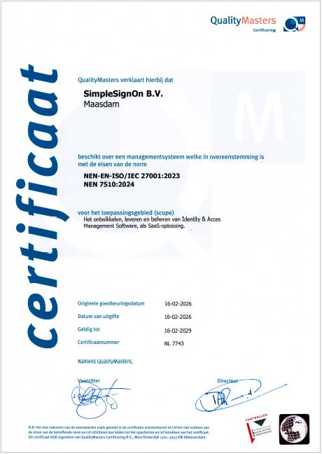 27 februari 2026ISO-certificeringen behaaldWij nu officieel ISO 27001- en NEN 7510-gecertificeerd! Na een nulmeting door MSP Mentor volgde en een intensief audit-traject van bijna een jaar uitgevoerd door Quality Masters, gespecialiseerd in ISO-managementsystemen. Gedurende deze periode hebben wij - waar nodig - diverse…Lees meer14 februari 2026SimpleSignOn op IPON 2026Op 9 en 10 februari bemensden SimpleSignOn samen met de partners Vitasys en Acer een stand op de IPON-beurs in de Jaarbeurs in Utrecht. De IPON (Innovatie Platform Onderwijs en ICT Nederland) is een toonaangevende vakbeurs in Nederland met focus…Lees meer2 februari 2026Koppeling Basispoort gerealiseerdNa een periode van ontwikkeling is per 1 februari is de koppeling tussen SimpleSignOn en Basispoort actief! Basispoort is hét digitale toegangsplatform voor het Nederlandse basisonderwijs. Het zorgt ervoor dat leerlingen en leerkrachten met één account veilig toegang hebben tot…Lees meer27 november 2025UPDATE: meer platformenNaast vloeiend werkend identiteitsbeheer en veilig inloggen voor Microsoft Entra en Google Workspace, breiden wij onze platformondersteuningen steeds verder uit. Onlangs zijn integraties met de volgende 2 platformen gereed gekomen: JAMF voor identiteitsbeheer en apparaatbeheer in een Apple-omgeving. Intune voor…Lees meer11 september 2025Conditionele toegang in SimpleSignOnWe hebben conditionele toegang toegevoegd aan de inlogmogelijkheden van SimpleSignOn. Dit zorgt ervoor dat inloggen nog beter beheersbaar en veiliger is. Zo kun je instellen dat inloggen uitsluitend kan binnen een bepaalde schoolomgeving of binnen een specifiek bedrijfsnetwerk. Daarnaast biedt…Lees meer5 maart 2025SimpleSignOn onderdeel van BIT ICT GroepWij zijn verheugd om te melden dat SimpleSignOn per medio februari onderdeel is geworden van de Bit ICT Groep! Vitasys, ook onderdeel van BIT, werkt al jaren samen met deze jonge club nuchtere ict-ers. SimpleSignOn draagt graag zijn specialisme bij…Lees meer4 maart 2025We are hiring!SimpleSignOn is bezig met het werven van een Softwareontwikkelaar / DevOps engineer, die ons team kan versterken. Ben jij of ken jij iemand die zich als een vis in het water voelt in een klein internationaal team? We hebben al…Lees meer27 februari 2025Start gemaakt met ISO27001- en NEN7510- certificeringOp 26 februari 2025 heeft SimpleSignon een start gemaakt met ons certificeringstraject. Die dag heeft een externe partij, MSP Mentor, een nulmeting bij ons uitgevoerd. Al snel bleek dat we al een hoop dingen goed doen. Inmiddels is er een…Lees meer5 februari 2025SimpleSignOn sluit overeenkomst met BasispoortIn januari hebben wij een overeenkomst gesloten met Basispoort. Inmiddels zijn we gestart met de ontwikkeling van de integratie. Via Basispoort krijgt vrijwel elke basisschoolleerling in Nederland toegang tot leermiddelen van diverse uitgevers. Met onze nieuwe koppeling maken wij het…Lees meer12 januari 2025SimpleSignOn sluit intentieverklaring met Edu-VEdu-V is een nieuw publiek-privaat initiatief binnen het onderwijs, dat streeft naar het samenbrengen en uniformeren van privacy-afspraken tussen partijen in het onderwijs. Edu-V ontwikkelt een afsprakenstelsel waarin technische koppelvlakken worden gestandaardiseerd en privacy-afspraken in het onderwijs worden verbeterd en…Lees meer12 juni 2024Nieuwe koppelingen in SimpleSignOnDe ontwikkeling van SimpleSignOn staat nooit stil. Met de laatste release zijn er onder andere koppelingen toegevoegd met ParnasSys, HR2Day en Microsoft Entra ID.Lees meer13 februari 2024Uitbreiden functies klassenbeheerOp dit moment zijn we druk bezig met het uitbreiden van ons klassenbeheer. We hebben de volgende functionaliteiten toegevoegd: Kunnen zien welke tabbladen er open staan. Alle tabbladen in alle browservensters zijn zichtbaar voor de leerkracht. Tabbladen kunnen gesloten worden…Lees meer